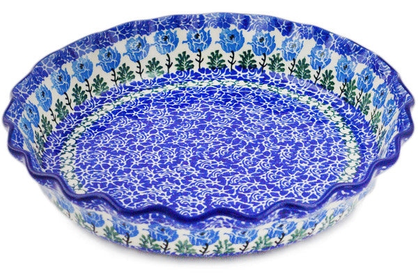 This Blue Rosette Wreath 10" Fluted Pie Dish was handmade and hand decorated in Boleslawiec, Poland by skilled artisans according to old traditional methods. This Polish stoneware is microwave, dishwasher, freezer, and oven safe up to 480°F. It does not contain lead or cadmium. It is part of the Blue Rosette Wreath Collection.