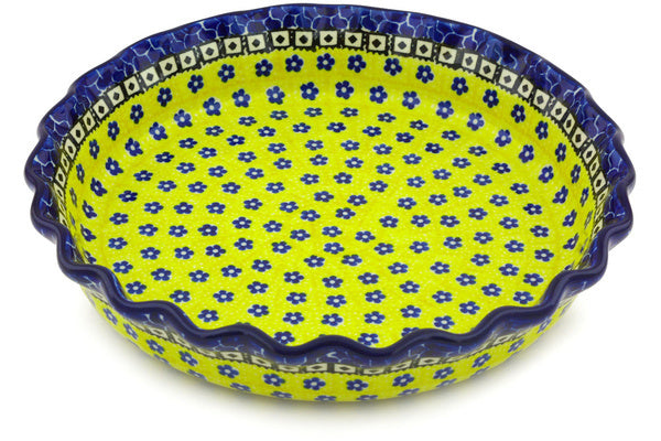 This Sunburst Daisies 10" Fluted Pie Dish was handmade and hand decorated in Boleslawiec, Poland by skilled artisans according to old traditional methods. This Polish stoneware is microwave, dishwasher, freezer, and oven safe up to 480°F. It does not contain lead or cadmium. It is part of the Sunburst Daisies Collection.