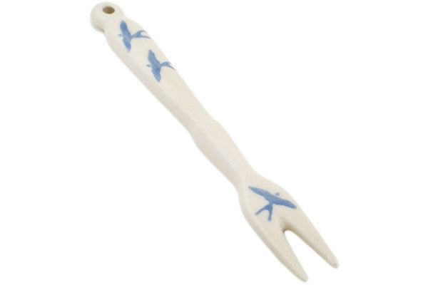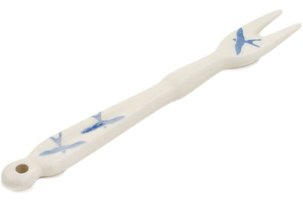 This Soaring Swallows 5" Fondue Fork was handmade and hand decorated in Boleslawiec, Poland by skilled artisans according to old traditional methods. This is a Polish pottery Signature Unikat, which means that it has been hand painted with both sponges and brushes and it is signed by the artist who painted it. Unikat pieces are the most intricate works of art. Larger Unikat items take hours of very careful work to finish. This Polish stoneware is microwave, dishwasher, freezer, and oven safe up to 480°F. It does not contain lead or cadmium. It is part of the Soaring Swallows Collection.
