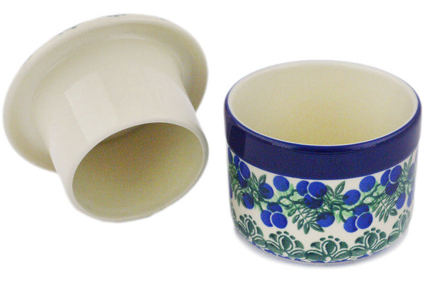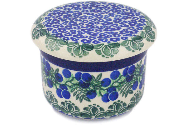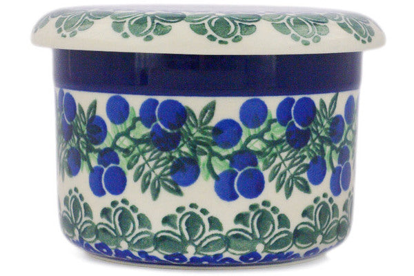 This Blueberry Fields Forever 4" French Butter Dish was handmade and hand decorated in Boleslawiec, Poland by skilled artisans according to old traditional methods. This Polish stoneware is microwave, dishwasher, freezer, and oven safe up to 480°F. It does not contain lead or cadmium. It is part of the Blueberry Fields Forever Collection.