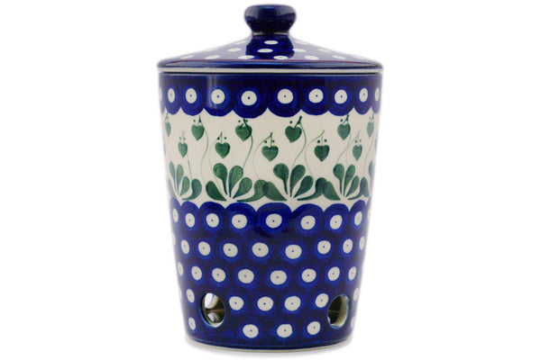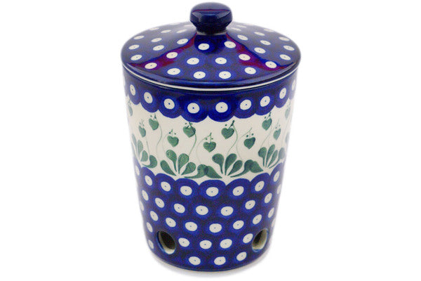 This Bleeding Heart Peacock 7" Garlic and Onion Jar was handmade and hand decorated in Boleslawiec, Poland by skilled artisans according to old traditional methods. This Polish stoneware is microwave, dishwasher, freezer, and oven safe up to 480°F. It does not contain lead or cadmium. It is part of the Bleeding Heart Peacock Collection.
