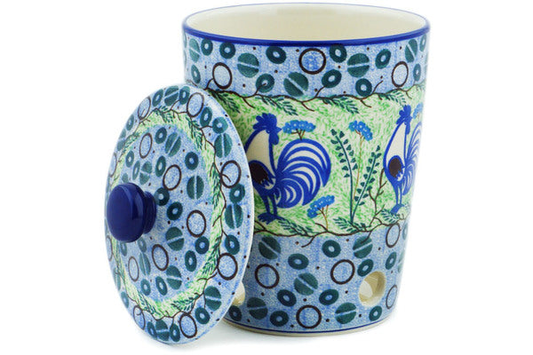 This Blue Rooster 7" Garlic and Onion Jar was handmade and hand decorated in Boleslawiec, Poland by skilled artisans according to old traditional methods. This is a Polish pottery Signature Unikat, which means that it has been hand painted with both sponges and brushes and it is signed by the artist who painted it. Unikat pieces are the most intricate works of art. Larger Unikat items take hours of very careful work to finish. This Polish stoneware is microwave, dishwasher, freezer, and oven safe up to 480°F. It does not contain lead or cadmium. It is part of the Blue Rooster Collection.