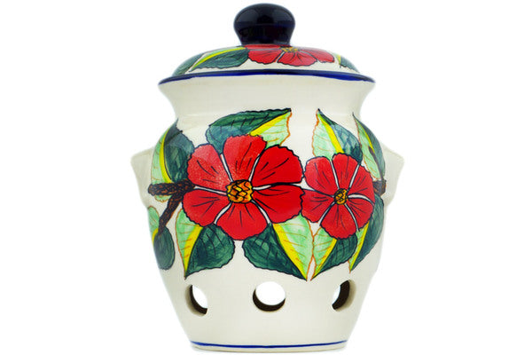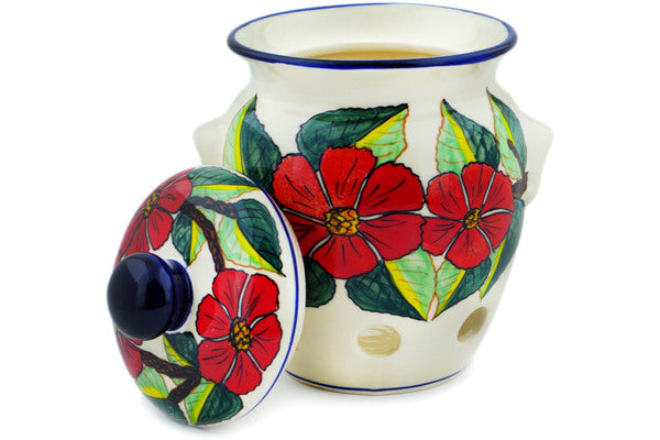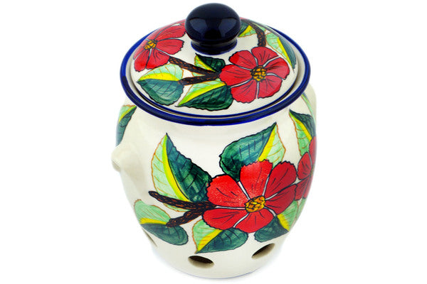 This Poinsettia Paradise 7" Garlic and Onion Jar was handmade and hand decorated in Boleslawiec, Poland by skilled artisans according to old traditional methods. This is a Polish pottery Signature Unikat, which means that it has been hand painted with both sponges and brushes and it is signed by the artist who painted it. Unikat pieces are the most intricate works of art. Larger Unikat items take hours of very careful work to finish. This Polish stoneware is microwave, dishwasher, freezer, and oven safe up to 480°F. It does not contain lead or cadmium. It is part of the Poinsettia Paradise Collection.