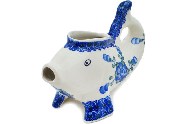 This Blue Poppies 7" Fish Shaped Creamer was handmade and hand decorated in Boleslawiec, Poland by skilled artisans according to old traditional methods. This Polish stoneware is microwave, dishwasher, freezer, and oven safe up to 480°F. It does not contain lead or cadmium. It is part of the Blue Poppies Collection.