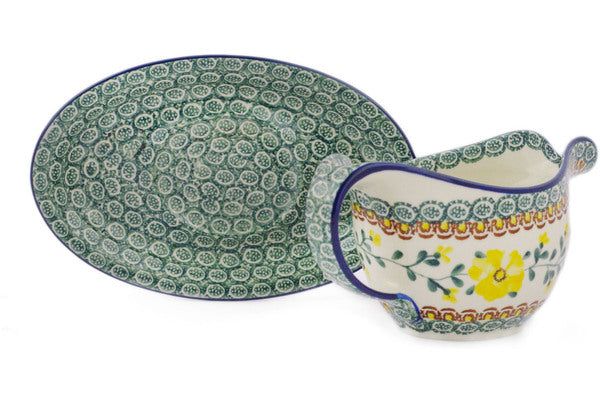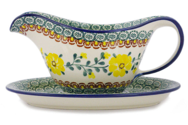 This Lemonade Flowers 20 oz Gravy Boat with Saucer was handmade and hand decorated in Boleslawiec, Poland by skilled artisans according to old traditional methods. This Polish stoneware is microwave, dishwasher, freezer, and oven safe up to 480°F. It does not contain lead or cadmium. It is part of the Lemonade Flowers Collection.