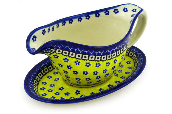 This Sunburst Daisies 20 oz Gravy Boat with Saucer was handmade and hand decorated in Boleslawiec, Poland by skilled artisans according to old traditional methods. This Polish stoneware is microwave, dishwasher, freezer, and oven safe up to 480°F. It does not contain lead or cadmium. It is part of the Sunburst Daisies Collection.