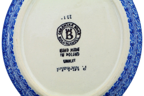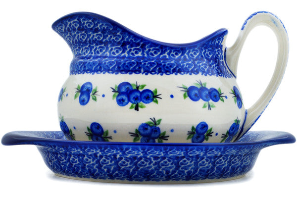 This Blueberry Dreams Gravy Boat with Saucer was handmade and hand decorated in Boleslawiec, Poland by skilled artisans according to old traditional methods. This Polish stoneware is microwave, dishwasher, freezer, and oven safe up to 480°F. It does not contain lead or cadmium. It is part of the Blueberry Dreams Collection.