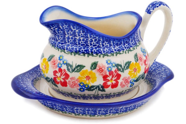 This Hibiscus Haven Gravy Boat with Saucer was handmade and hand decorated in Boleslawiec, Poland by skilled artisans according to old traditional methods. This Polish stoneware is microwave, dishwasher, freezer, and oven safe up to 480°F. It does not contain lead or cadmium. It is part of the Hibiscus Haven Collection.
