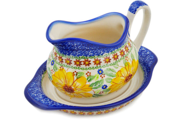 This Sunflower Yellow Petal Bliss Gravy Boat with Saucer was handmade and hand decorated in Boleslawiec, Poland by skilled artisans according to old traditional methods. This is a Polish pottery Signature Unikat, which means that it has been hand painted with both sponges and brushes and it is signed by the artist who painted it. Unikat pieces are the most intricate works of art. Larger Unikat items take hours of very careful work to finish. This Polish stoneware is microwave, dishwasher, freezer, and oven safe up to 480°F. It does not contain lead or cadmium. It is part of the Sunflower Yellow Petal Bliss Collection.