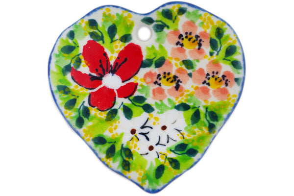 This Petal Dance 2" Heart Pendant was handmade and hand decorated in Boleslawiec, Poland by skilled artisans according to old traditional methods. This is a Polish pottery Signature Unikat, which means that it has been hand painted with both sponges and brushes and it is signed by the artist who painted it. Unikat pieces are the most intricate works of art. Larger Unikat items take hours of very careful work to finish. This Polish stoneware is microwave, dishwasher, freezer, and oven safe up to 480°F. It does not contain lead or cadmium. It is part of the Petal Dance Collection.