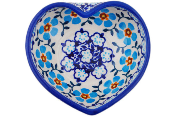 This Blue Chain 4" Heart Shaped Bowl was handmade and hand decorated in Boleslawiec, Poland by skilled artisans according to old traditional methods. This is a Polish pottery Signature Unikat, which means that it has been hand painted with both sponges and brushes and it is signed by the artist who painted it. Unikat pieces are the most intricate works of art. Larger Unikat items take hours of very careful work to finish. This Polish stoneware is microwave, dishwasher, freezer, and oven safe up to 480°F. It does not contain lead or cadmium. It is part of the Blue Chain Collection.