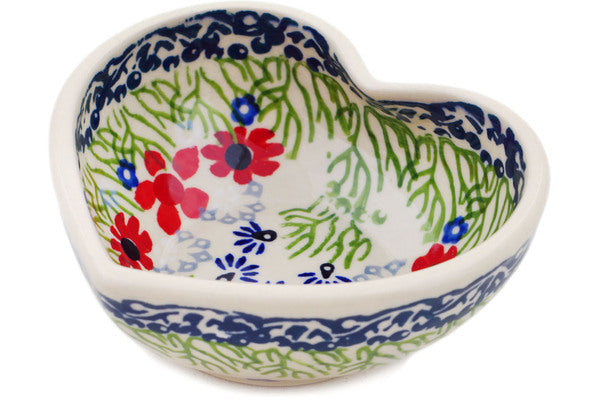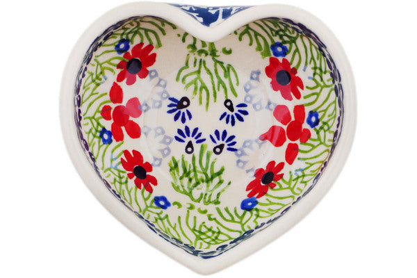 This Red Blossom 4" Heart Shaped Bowl was handmade and hand decorated in Boleslawiec, Poland by skilled artisans according to old traditional methods. This Polish stoneware is microwave, dishwasher, freezer, and oven safe up to 480°F. It does not contain lead or cadmium. It is part of the Red Blossom Collection.