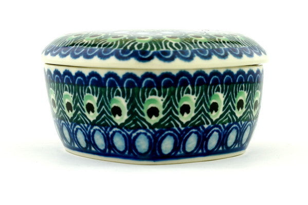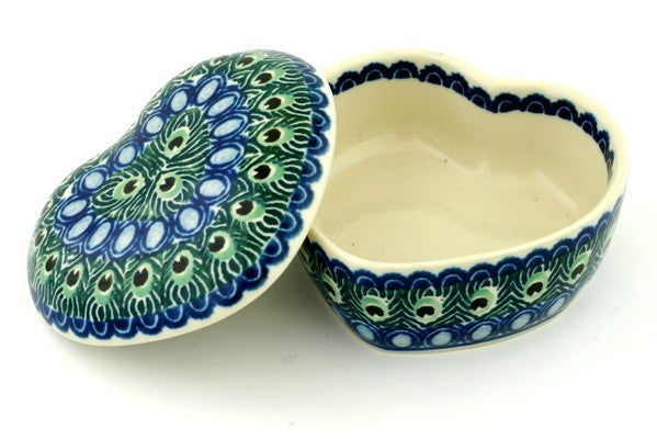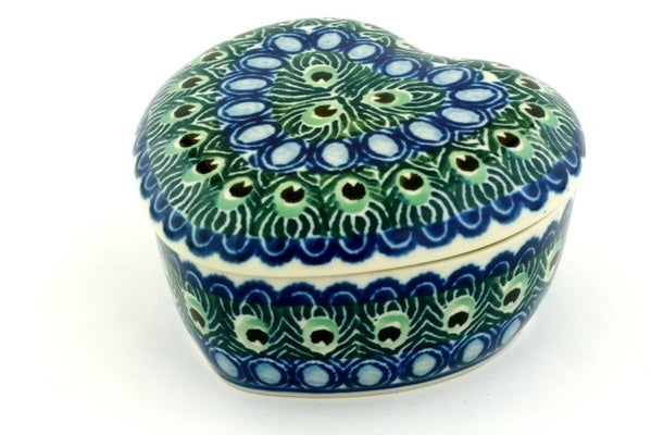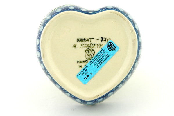 This Peacock Tail 4" Heart Shaped Jar was handmade and hand decorated in Boleslawiec, Poland by skilled artisans according to old traditional methods. This is a Polish pottery Signature Unikat, which means that it has been hand painted with both sponges and brushes and it is signed by the artist who painted it. Unikat pieces are the most intricate works of art. Larger Unikat items take hours of very careful work to finish. This Polish stoneware is microwave, dishwasher, freezer, and oven safe up to 480°F. It does not contain lead or cadmium. It is part of the Peacock Tail Collection.