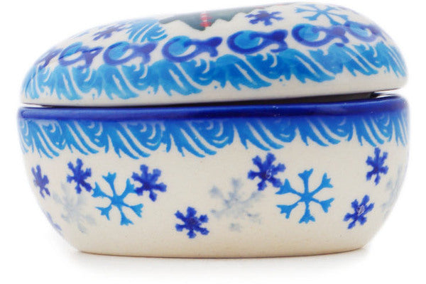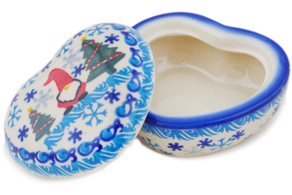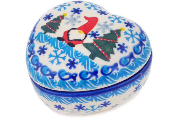 This Winter Gnome 4" Heart Shaped Jar was handmade and hand decorated in Boleslawiec, Poland by skilled artisans according to old traditional methods. This Polish stoneware is microwave, dishwasher, freezer, and oven safe up to 480°F. It does not contain lead or cadmium. It is part of the Winter Gnome Collection.