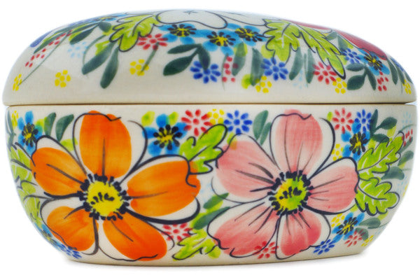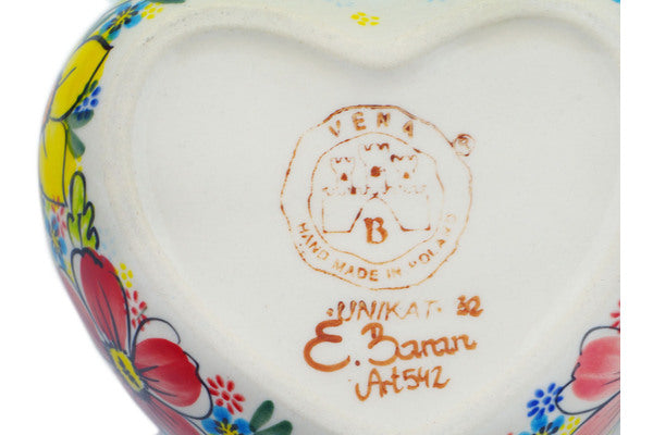 This Retro Garden 5" Heart Shaped Jar was handmade and hand decorated in Boleslawiec, Poland by skilled artisans according to old traditional methods. This is a Polish pottery Signature Unikat, which means that it has been hand painted with both sponges and brushes and it is signed by the artist who painted it. Unikat pieces are the most intricate works of art. Larger Unikat items take hours of very careful work to finish. This Polish stoneware is microwave, dishwasher, freezer, and oven safe up to 480°F. It does not contain lead or cadmium. It is part of the Retro Garden Collection.