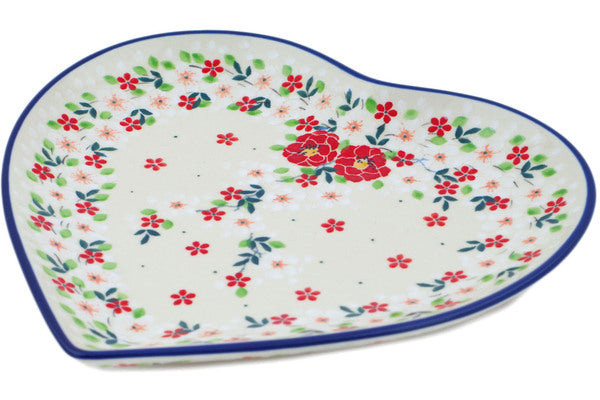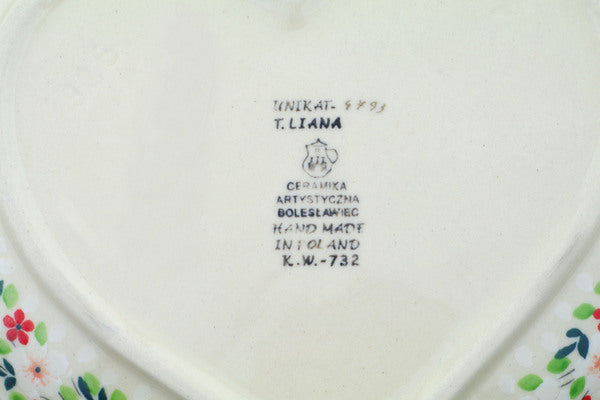 This Festive Mistletoe 9" Heart Shaped Platter was handmade and hand decorated in Boleslawiec, Poland by skilled artisans according to old traditional methods. This is a Polish pottery Signature Unikat, which means that it has been hand painted with both sponges and brushes and it is signed by the artist who painted it. Unikat pieces are the most intricate works of art. Larger Unikat items take hours of very careful work to finish. This Polish stoneware is microwave, dishwasher, freezer, and oven safe up to 480°F. It does not contain lead or cadmium. It is part of the Festive Mistletoe Collection.