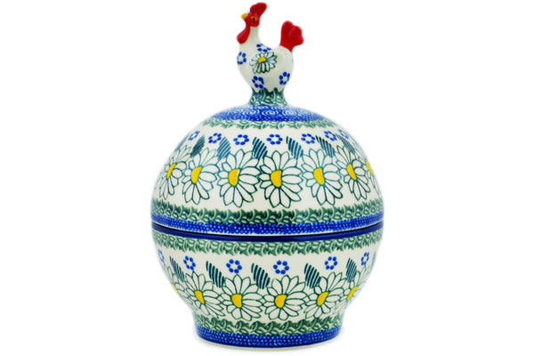 This Crazy Daisy 7" Hen Shaped Jar was handmade and hand decorated in Boleslawiec, Poland by skilled artisans according to old traditional methods. This Polish stoneware is microwave, dishwasher, freezer, and oven safe up to 480°F. It does not contain lead or cadmium. It is part of the Crazy Daisy Collection.