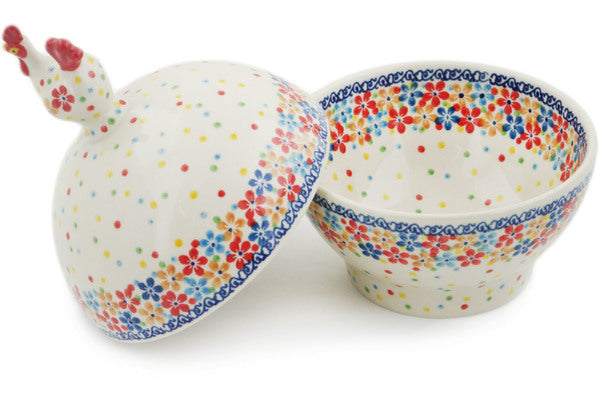 This Joy 7" Hen Shaped Jar was handmade and hand decorated in Boleslawiec, Poland by skilled artisans according to old traditional methods. This Polish stoneware is microwave, dishwasher, freezer, and oven safe up to 480°F. It does not contain lead or cadmium. It is part of the Joy Collection.