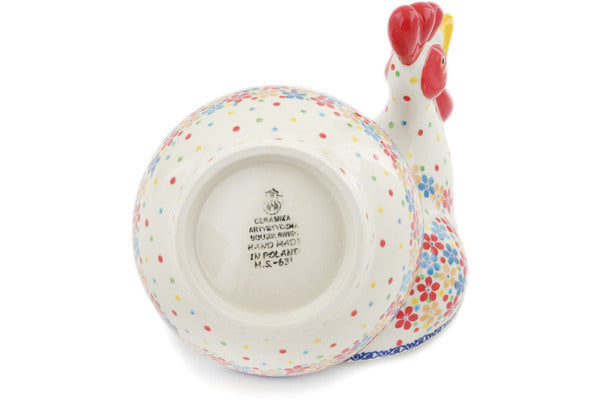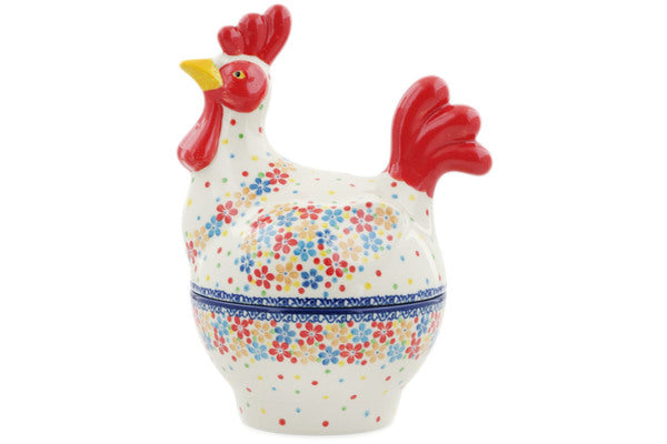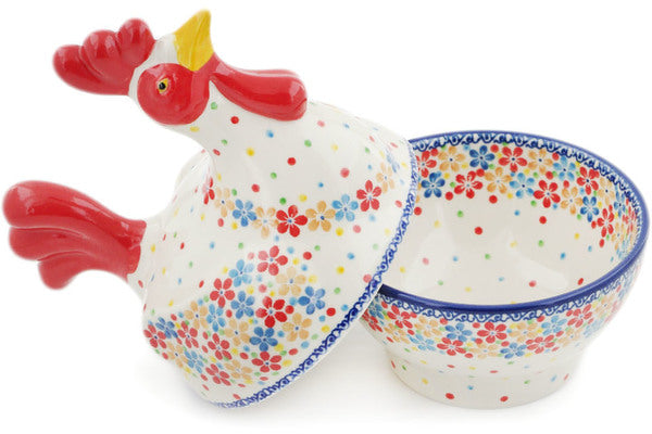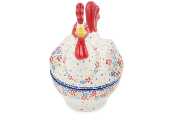 This Joy 8" Hen Shaped Jar was handmade and hand decorated in Boleslawiec, Poland by skilled artisans according to old traditional methods. This Polish stoneware is microwave, dishwasher, freezer, and oven safe up to 480°F. It does not contain lead or cadmium. It is part of the Joy Collection.