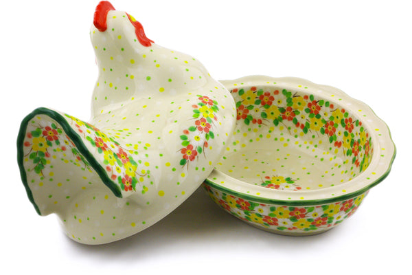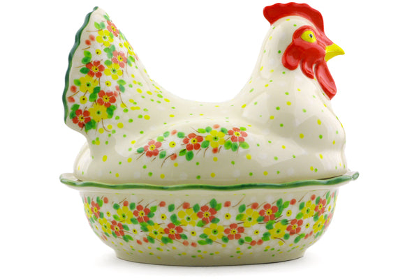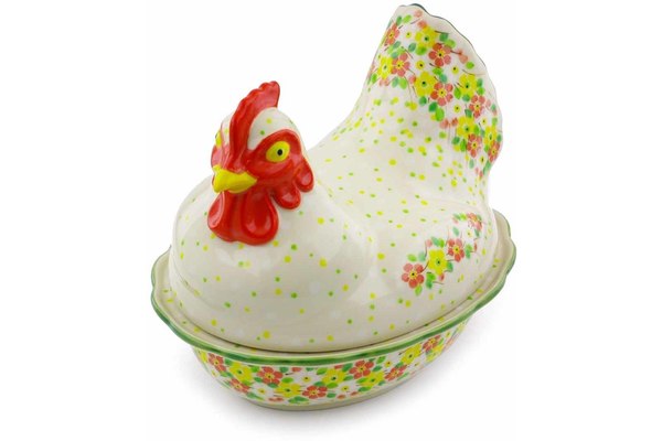 This Blossom Sprinkle 9" Hen Shaped Jar was handmade and hand decorated in Boleslawiec, Poland by skilled artisans according to old traditional methods. This is a Polish pottery Signature Unikat, which means that it has been hand painted with both sponges and brushes and it is signed by the artist who painted it. Unikat pieces are the most intricate works of art. Larger Unikat items take hours of very careful work to finish. This Polish stoneware is microwave, dishwasher, freezer, and oven safe up to 480°F. It does not contain lead or cadmium. It is part of the Blossom Sprinkle Collection.