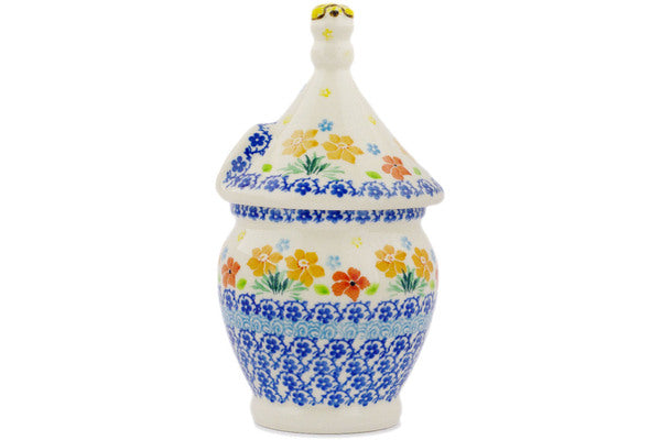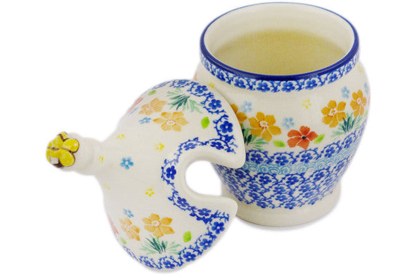 This Creamy Saffron 12 oz Honey Jar was handmade and hand decorated in Boleslawiec, Poland by skilled artisans according to old traditional methods. This Polish stoneware is microwave, dishwasher, freezer, and oven safe up to 480°F. It does not contain lead or cadmium. It is part of the Creamy Saffron Collection.