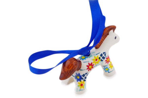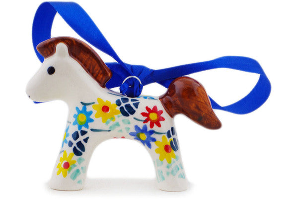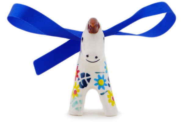 This Primary Spring 3" Horse Ornament was handmade and hand decorated in Boleslawiec, Poland by skilled artisans according to old traditional methods. This is a Polish pottery Signature Unikat, which means that it has been hand painted with both sponges and brushes and it is signed by the artist who painted it. Unikat pieces are the most intricate works of art. Larger Unikat items take hours of very careful work to finish. This Polish stoneware is microwave, dishwasher, freezer, and oven safe up to 480°F. It does not contain lead or cadmium. It is part of the Primary Spring Collection.