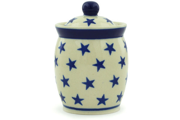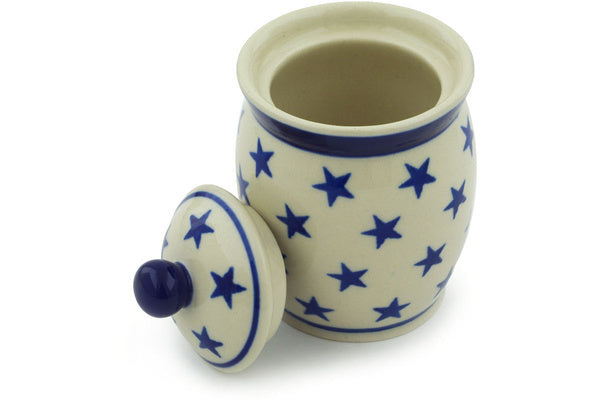 This Starburst Americana 4" Jar with Lid was handmade and hand decorated in Boleslawiec, Poland by skilled artisans according to old traditional methods. This Polish stoneware is microwave, dishwasher, freezer, and oven safe up to 480°F. It does not contain lead or cadmium. It is part of the Starburst Americana Collection.