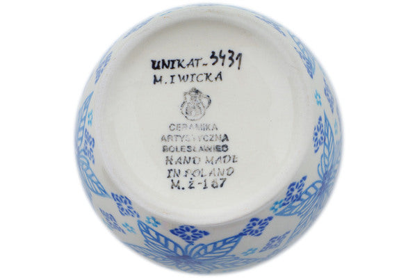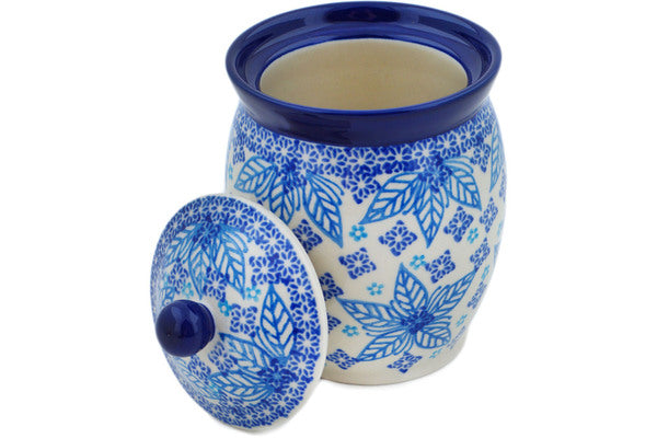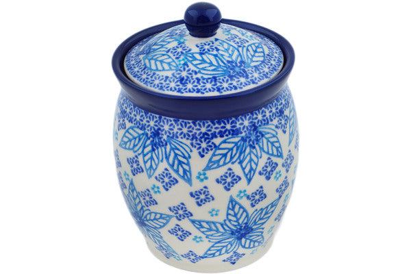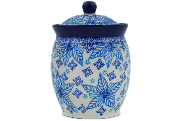 This Blue Poinsettia 5" Jar with Lid was handmade and hand decorated in Boleslawiec, Poland by skilled artisans according to old traditional methods. This is a Polish pottery Signature Unikat, which means that it has been hand painted with both sponges and brushes and it is signed by the artist who painted it. Unikat pieces are the most intricate works of art. Larger Unikat items take hours of very careful work to finish. This Polish stoneware is microwave, dishwasher, freezer, and oven safe up to 480°F. It does not contain lead or cadmium. It is part of the Blue Poinsettia Collection.