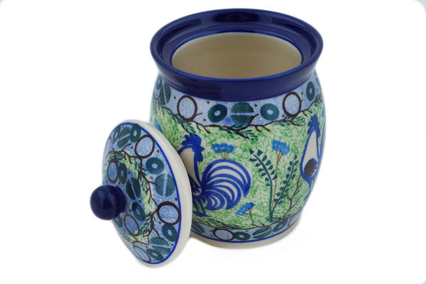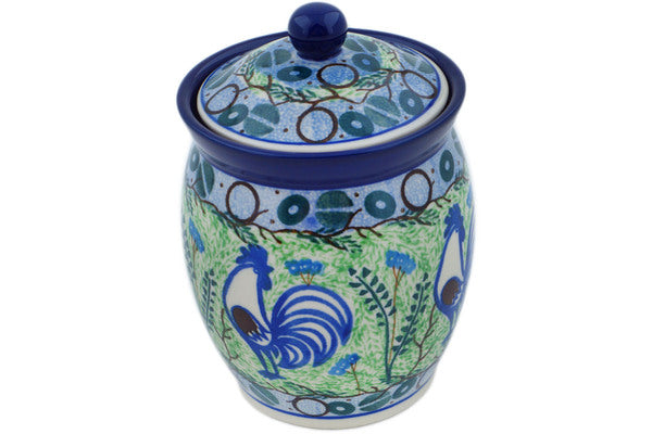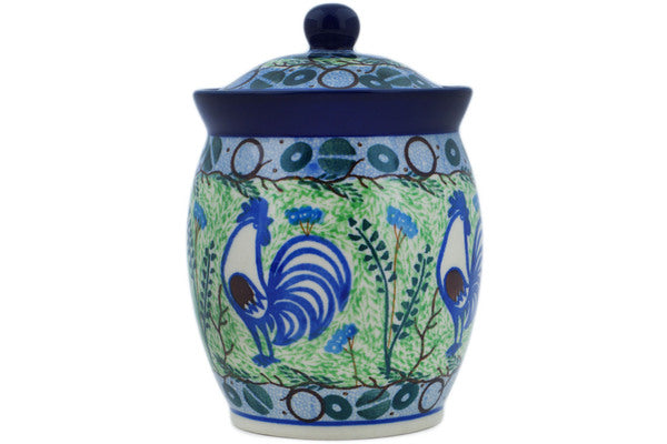 This Blue Rooster 5" Jar with Lid was handmade and hand decorated in Boleslawiec, Poland by skilled artisans according to old traditional methods. This is a Polish pottery Signature Unikat, which means that it has been hand painted with both sponges and brushes and it is signed by the artist who painted it. Unikat pieces are the most intricate works of art. Larger Unikat items take hours of very careful work to finish. This Polish stoneware is microwave, dishwasher, freezer, and oven safe up to 480°F. It does not contain lead or cadmium. It is part of the Blue Rooster Collection.