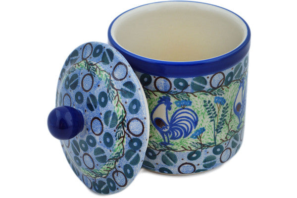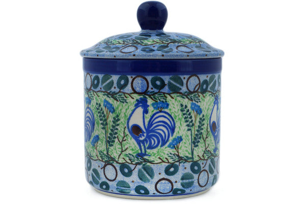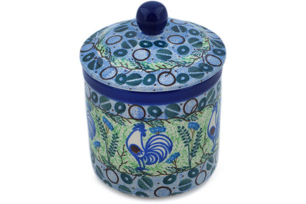 This Blue Rooster 5" Jar with Lid was handmade and hand decorated in Boleslawiec, Poland by skilled artisans according to old traditional methods. This is a Polish pottery Signature Unikat, which means that it has been hand painted with both sponges and brushes and it is signed by the artist who painted it. Unikat pieces are the most intricate works of art. Larger Unikat items take hours of very careful work to finish. This Polish stoneware is microwave, dishwasher, freezer, and oven safe up to 480°F. It does not contain lead or cadmium. It is part of the Blue Rooster Collection.