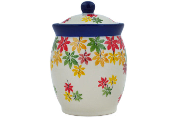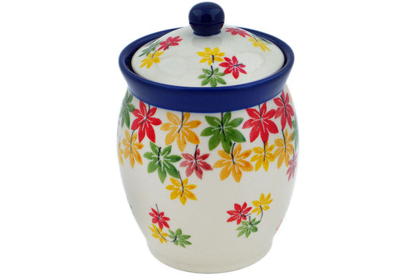 This Collecting Leaves 5" Jar with Lid was handmade and hand decorated in Boleslawiec, Poland by skilled artisans according to old traditional methods. This is a Polish pottery Signature Unikat, which means that it has been hand painted with both sponges and brushes and it is signed by the artist who painted it. Unikat pieces are the most intricate works of art. Larger Unikat items take hours of very careful work to finish. This Polish stoneware is microwave, dishwasher, freezer, and oven safe up to 480°F. It does not contain lead or cadmium. It is part of the Collecting Leaves Collection.