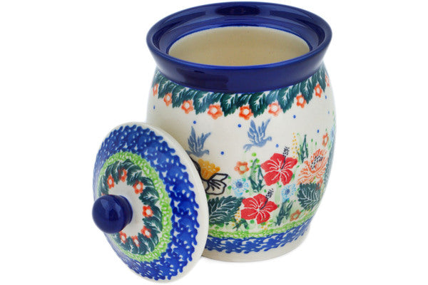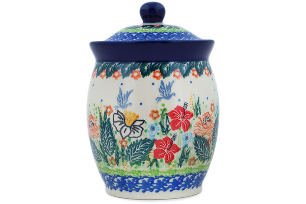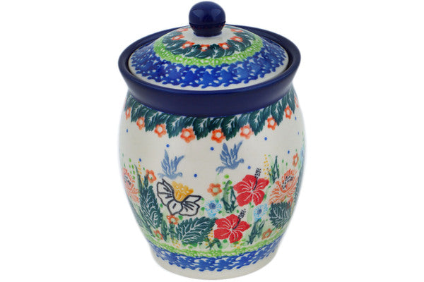 This Dove Escape 5" Jar with Lid was handmade and hand decorated in Boleslawiec, Poland by skilled artisans according to old traditional methods. This is a Polish pottery Signature Unikat, which means that it has been hand painted with both sponges and brushes and it is signed by the artist who painted it. Unikat pieces are the most intricate works of art. Larger Unikat items take hours of very careful work to finish. This Polish stoneware is microwave, dishwasher, freezer, and oven safe up to 480°F. It does not contain lead or cadmium. It is part of the Dove Escape Collection.