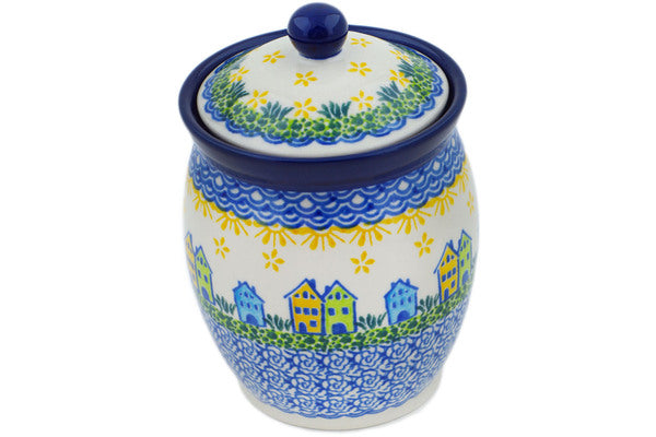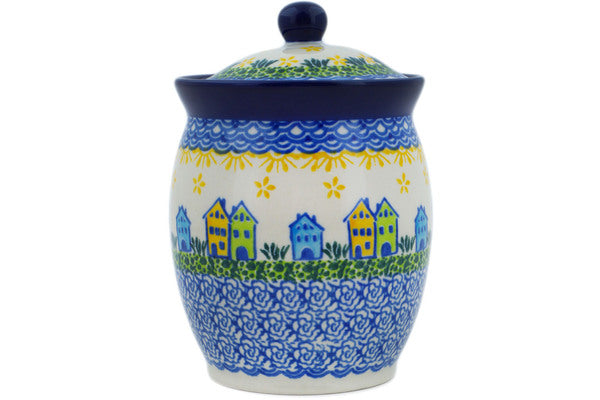 This Riverside Village 5" Jar with Lid was handmade and hand decorated in Boleslawiec, Poland by skilled artisans according to old traditional methods. This is a Polish pottery Signature Unikat, which means that it has been hand painted with both sponges and brushes and it is signed by the artist who painted it. Unikat pieces are the most intricate works of art. Larger Unikat items take hours of very careful work to finish. This Polish stoneware is microwave, dishwasher, freezer, and oven safe up to 480°F. It does not contain lead or cadmium. It is part of the Riverside Village Collection.
