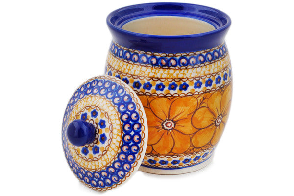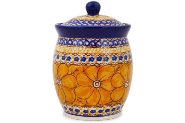 This Marigold Dreams 6" Jar with Lid was handmade and hand decorated in Boleslawiec, Poland by skilled artisans according to old traditional methods. This is a Polish pottery Signature Unikat, which means that it has been hand painted with both sponges and brushes and it is signed by the artist who painted it. Unikat pieces are the most intricate works of art. Larger Unikat items take hours of very careful work to finish. This Polish stoneware is microwave, dishwasher, freezer, and oven safe up to 480°F. It does not contain lead or cadmium. It is part of the Marigold Dreams Collection.