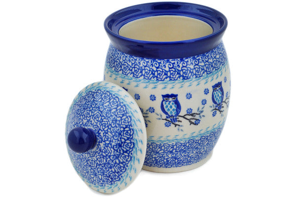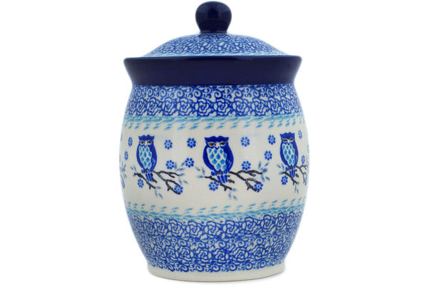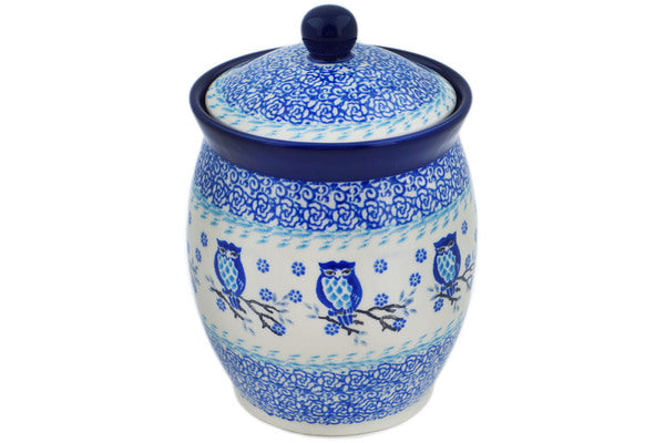 This Owl Kingdom 6" Jar with Lid was handmade and hand decorated in Boleslawiec, Poland by skilled artisans according to old traditional methods. This is a Polish pottery Signature Unikat, which means that it has been hand painted with both sponges and brushes and it is signed by the artist who painted it. Unikat pieces are the most intricate works of art. Larger Unikat items take hours of very careful work to finish. This Polish stoneware is microwave, dishwasher, freezer, and oven safe up to 480°F. It does not contain lead or cadmium. It is part of the Owl Kingdom Collection.
