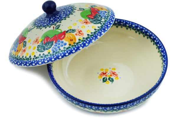 This Fruit Medley 7" Jar with Lid was handmade and hand decorated in Boleslawiec, Poland by skilled artisans according to old traditional methods. This is a Polish pottery Signature Unikat, which means that it has been hand painted with both sponges and brushes and it is signed by the artist who painted it. Unikat pieces are the most intricate works of art. Larger Unikat items take hours of very careful work to finish. This Polish stoneware is microwave, dishwasher, freezer, and oven safe up to 480°F. It does not contain lead or cadmium. It is part of the Fruit Medley Collection.