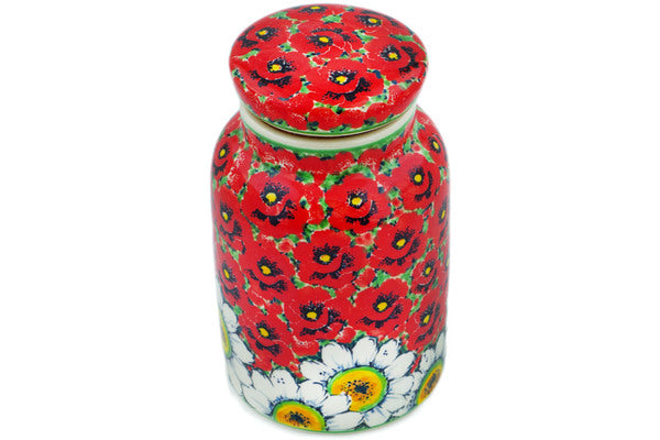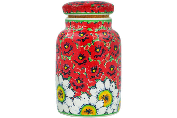 This Sweet Red Petals 7" Jar with Lid was handmade and hand decorated in Boleslawiec, Poland by skilled artisans according to old traditional methods. This is a Polish pottery Signature Unikat, which means that it has been hand painted with both sponges and brushes and it is signed by the artist who painted it. Unikat pieces are the most intricate works of art. Larger Unikat items take hours of very careful work to finish. This Polish stoneware is microwave, dishwasher, freezer, and oven safe up to 480°F. It does not contain lead or cadmium. It is part of the Sweet Red Petals Collection.