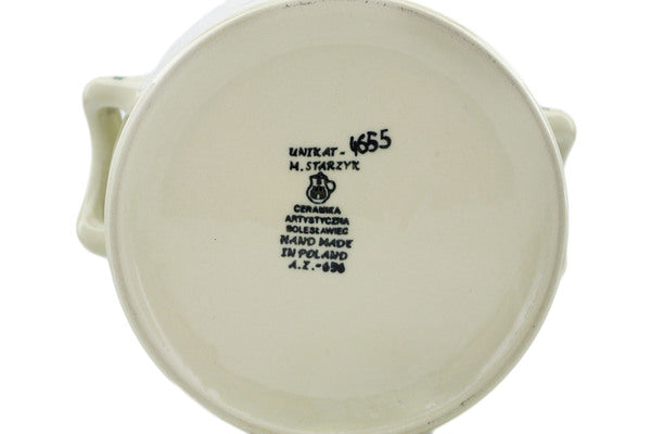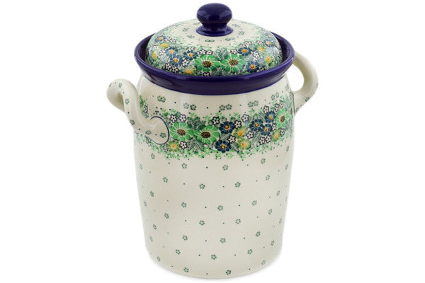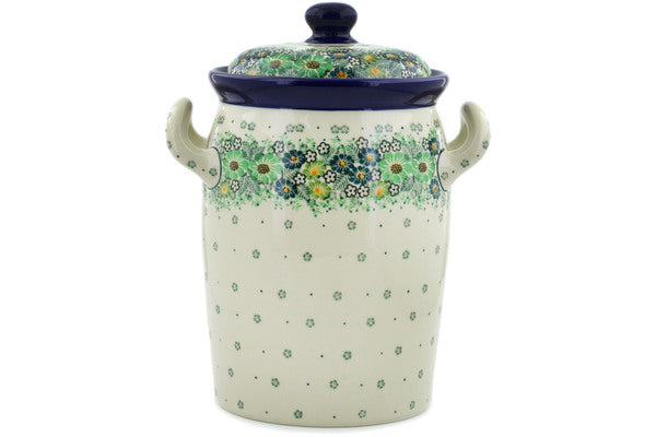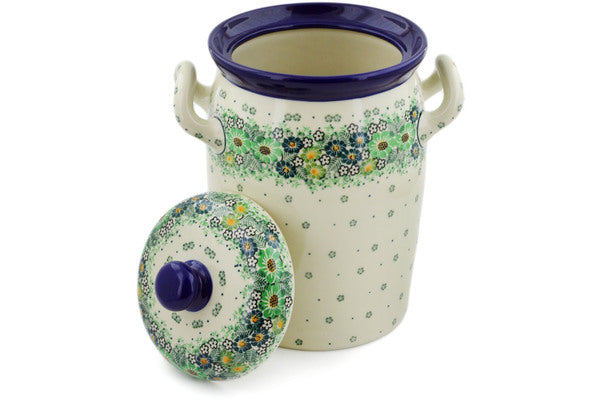 This Green Wreath 11" Jar with Lid and Handles was handmade and hand decorated in Boleslawiec, Poland by skilled artisans according to old traditional methods. This is a Polish pottery Signature Unikat, which means that it has been hand painted with both sponges and brushes and it is signed by the artist who painted it. Unikat pieces are the most intricate works of art. Larger Unikat items take hours of very careful work to finish. This Polish stoneware is microwave, dishwasher, freezer, and oven safe up to 480°F. It does not contain lead or cadmium. It is part of the Green Wreath Collection.