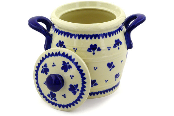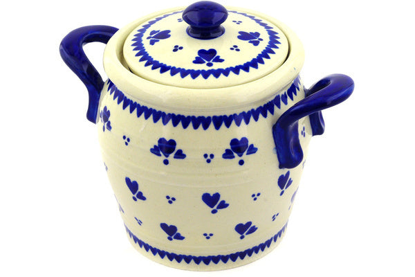 This Blue Heart Trio 7" Jar with Lid and Handles was handmade and hand decorated in Boleslawiec, Poland by skilled artisans according to old traditional methods. This Polish stoneware is microwave, dishwasher, freezer, and oven safe up to 480°F. It does not contain lead or cadmium. It is part of the Blue Heart Trio Collection.