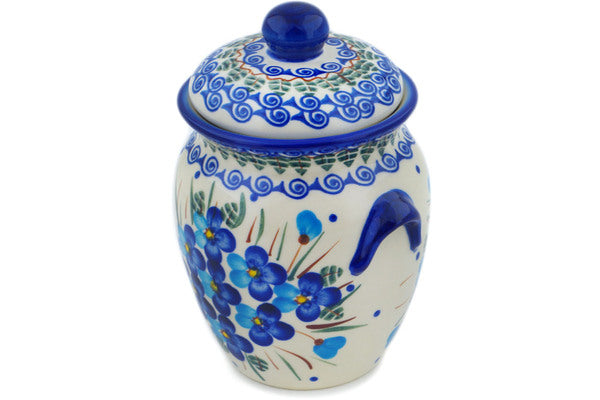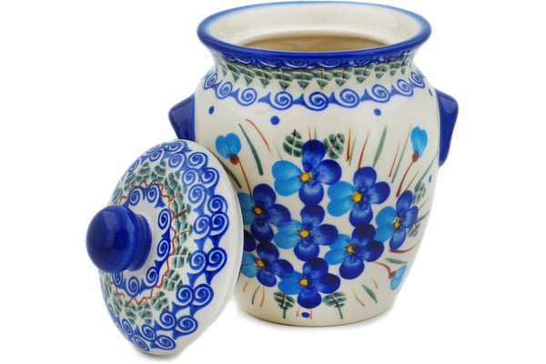 This Blue Pansy 7" Jar with Lid and Handles was handmade and hand decorated in Boleslawiec, Poland by skilled artisans according to old traditional methods. This Polish stoneware is microwave, dishwasher, freezer, and oven safe up to 480°F. It does not contain lead or cadmium. It is part of the Blue Pansy Collection.