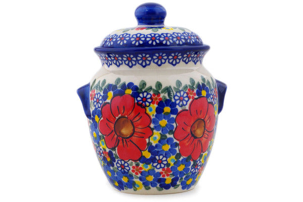 This Bold Sights 7" Jar with Lid and Handles was handmade and hand decorated in Boleslawiec, Poland by skilled artisans according to old traditional methods. This is a Polish pottery Signature Unikat, which means that it has been hand painted with both sponges and brushes and it is signed by the artist who painted it. Unikat pieces are the most intricate works of art. Larger Unikat items take hours of very careful work to finish. This Polish stoneware is microwave, dishwasher, freezer, and oven safe up to 480°F. It does not contain lead or cadmium. It is part of the Bold Sights Collection.