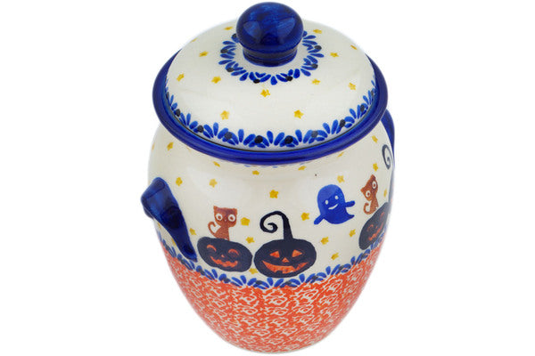 This Jack-O-Lantern Fun 7" Jar with Lid and Handles was handmade and hand decorated in Boleslawiec, Poland by skilled artisans according to old traditional methods. This Polish stoneware is microwave, dishwasher, freezer, and oven safe up to 480°F. It does not contain lead or cadmium. It is part of the Jack-O-Lantern Fun Collection.