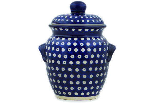 This Blue Eyed Peacock 9" Jar with Lid and Handles was handmade and hand decorated in Boleslawiec, Poland by skilled artisans according to old traditional methods. This Polish stoneware is microwave, dishwasher, freezer, and oven safe up to 480°F. It does not contain lead or cadmium. It is part of the Blue Eyed Peacock Collection.