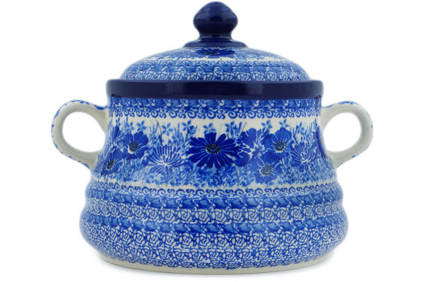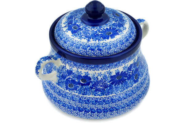 This Dreams In Blue 9" Jar with Lid and Handles was handmade and hand decorated in Boleslawiec, Poland by skilled artisans according to old traditional methods. This is a Polish pottery Signature Unikat, which means that it has been hand painted with both sponges and brushes and it is signed by the artist who painted it. Unikat pieces are the most intricate works of art. Larger Unikat items take hours of very careful work to finish. This Polish stoneware is microwave, dishwasher, freezer, and oven safe up to 480°F. It does not contain lead or cadmium. It is part of the Dreams In Blue Collection.