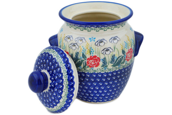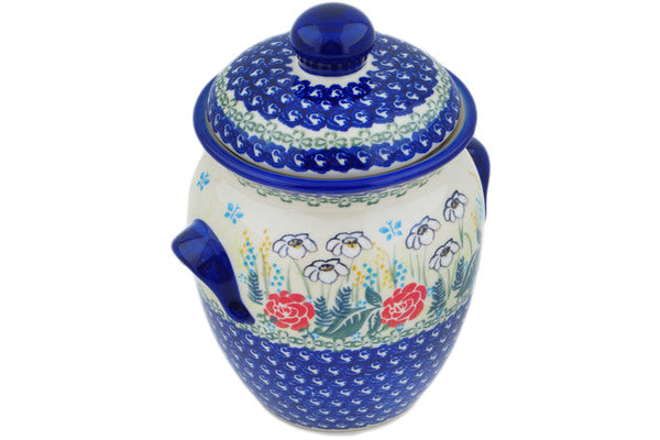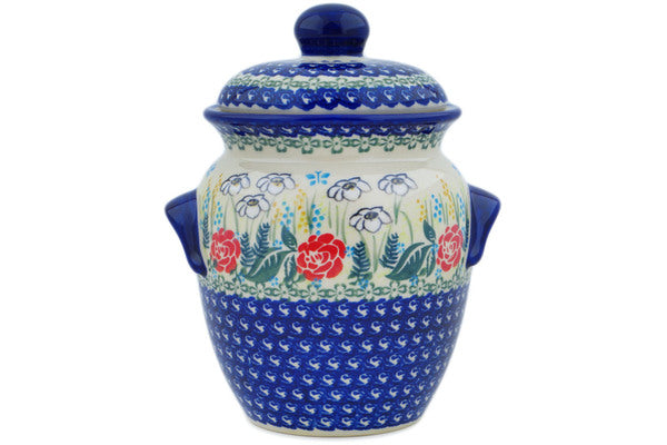 This Fresh Happiness 9" Jar with Lid and Handles was handmade and hand decorated in Boleslawiec, Poland by skilled artisans according to old traditional methods. This is a Polish pottery Signature Unikat, which means that it has been hand painted with both sponges and brushes and it is signed by the artist who painted it. Unikat pieces are the most intricate works of art. Larger Unikat items take hours of very careful work to finish. This Polish stoneware is microwave, dishwasher, freezer, and oven safe up to 480°F. It does not contain lead or cadmium. It is part of the Fresh Happiness Collection.