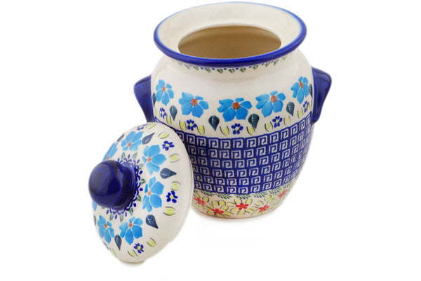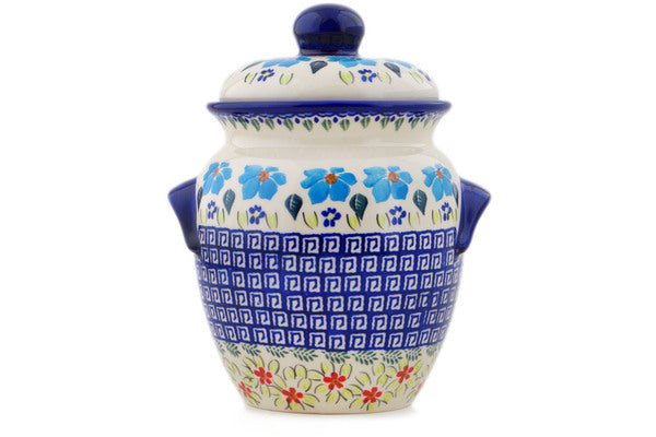 This Pansy Morning 9" Jar with Lid and Handles was handmade and hand decorated in Boleslawiec, Poland by skilled artisans according to old traditional methods. This Polish stoneware is microwave, dishwasher, freezer, and oven safe up to 480°F. It does not contain lead or cadmium. It is part of the Pansy Morning Collection.