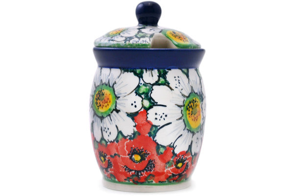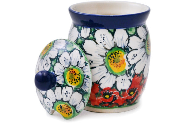 This Sweet Red Petals 4" Jar with Lid with Opening was handmade and hand decorated in Boleslawiec, Poland by skilled artisans according to old traditional methods. This is a Polish pottery Signature Unikat, which means that it has been hand painted with both sponges and brushes and it is signed by the artist who painted it. Unikat pieces are the most intricate works of art. Larger Unikat items take hours of very careful work to finish. This Polish stoneware is microwave, dishwasher, freezer, and oven safe up to 480°F. It does not contain lead or cadmium. It is part of the Sweet Red Petals Collection.
