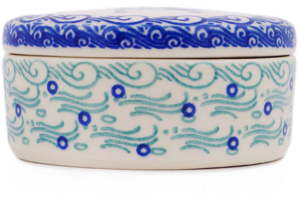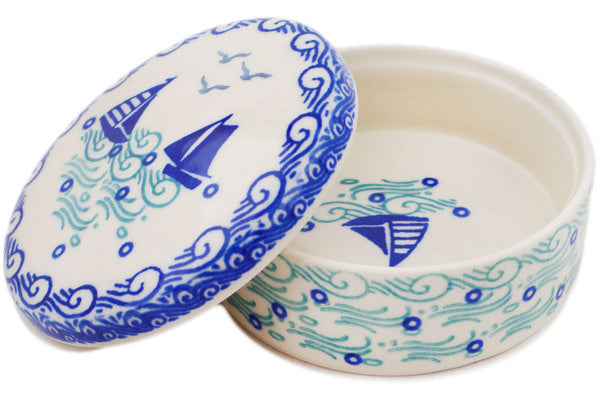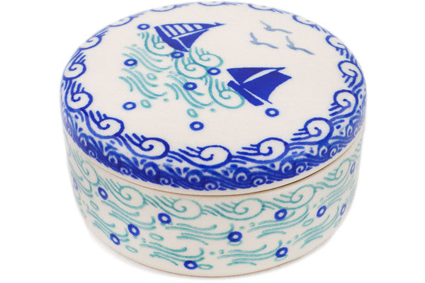 This Sailing Day 4" Jewelry Box was handmade and hand decorated in Boleslawiec, Poland by skilled artisans according to old traditional methods. This Polish stoneware is microwave, dishwasher, freezer, and oven safe up to 480°F. It does not contain lead or cadmium. It is part of the Sailing Day Collection.