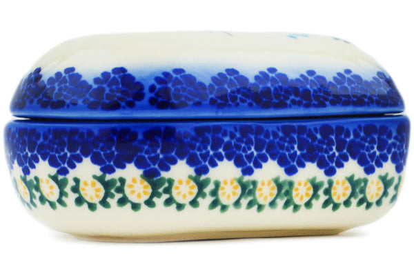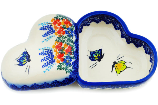 This Flutters In The Wind 5" Jewelry Box was handmade and hand decorated in Boleslawiec, Poland by skilled artisans according to old traditional methods. This is a Polish pottery Signature Unikat, which means that it has been hand painted with both sponges and brushes and it is signed by the artist who painted it. Unikat pieces are the most intricate works of art. Larger Unikat items take hours of very careful work to finish. This Polish stoneware is microwave, dishwasher, freezer, and oven safe up to 480°F. It does not contain lead or cadmium. It is part of the Flutters In The Wind Collection.
