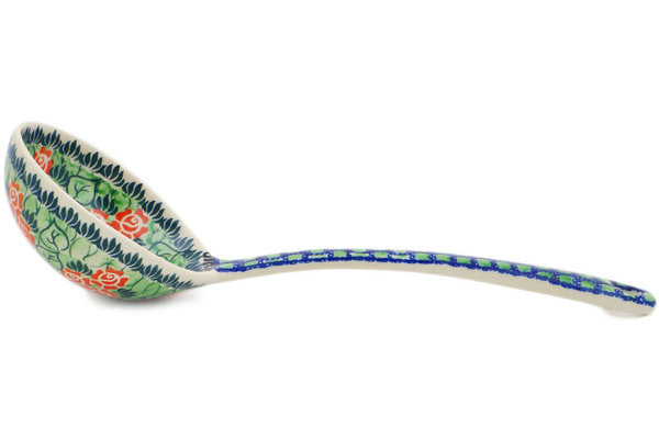 This Red Impatiens 13" Ladle was handmade and hand decorated in Boleslawiec, Poland by skilled artisans according to old traditional methods. This is a Polish pottery Signature Unikat, which means that it has been hand painted with both sponges and brushes and it is signed by the artist who painted it. Unikat pieces are the most intricate works of art. Larger Unikat items take hours of very careful work to finish. This Polish stoneware is microwave, dishwasher, freezer, and oven safe up to 480°F. It does not contain lead or cadmium. It is part of the Red Impatiens Collection.